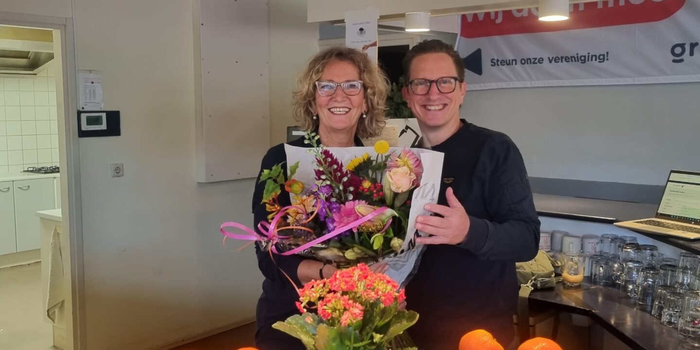 Karin van Zutphen werd afgelopen week door voorzitter Geert Moelker in het zonnetje gezet vanwege haar jarenlange, grote inzet en energie voor het draaien van de bar in het clubgebouw van AV Gouda tijdens wedstrijddagen en bijeenkomsten.