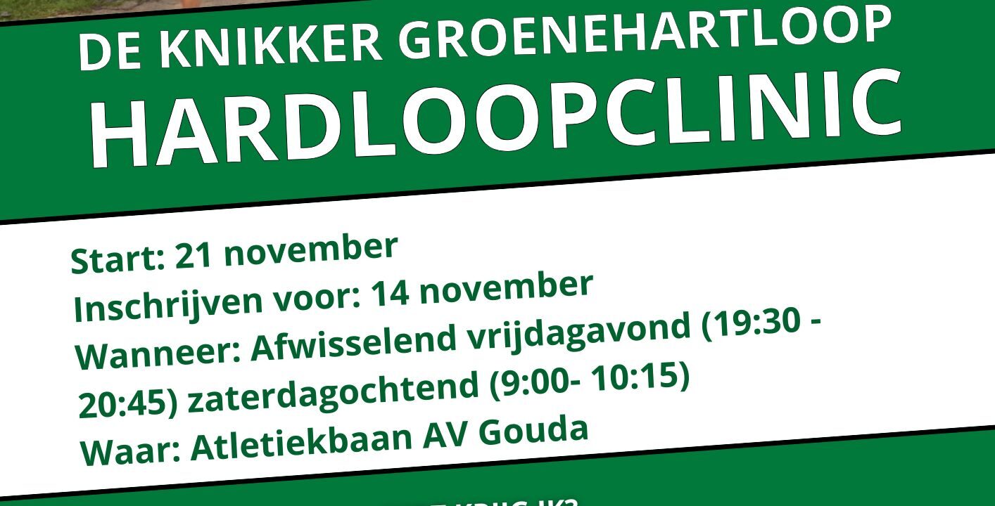 Ter voorbereiding op De Knikker Groenehartloop 2026 organiseert AV Gouda van november 2025 t/m februari 2026 een hardloopclinic. In tien trainingen op afwisselend vrijdagavond en zaterdagochtend bereid je je voor op het lopen van de 5 of 10 kilometer. De eerste training is op vrijdagavond 21 november. Deelname aan de clinic, inclusief een startbewijs voor de Groenehartloop en koffie/thee na de trainingen kost 65 euro. Meer informatie, de precieze trainingsdata en het inschrijfformulier vind je hier. Schrijf je voor 14 november in. Vol = vol. Let op: het maximum aantal inschrijvingen was vorig jaar razendsnel bereikt, dus wacht niet te lang met inschrijven.